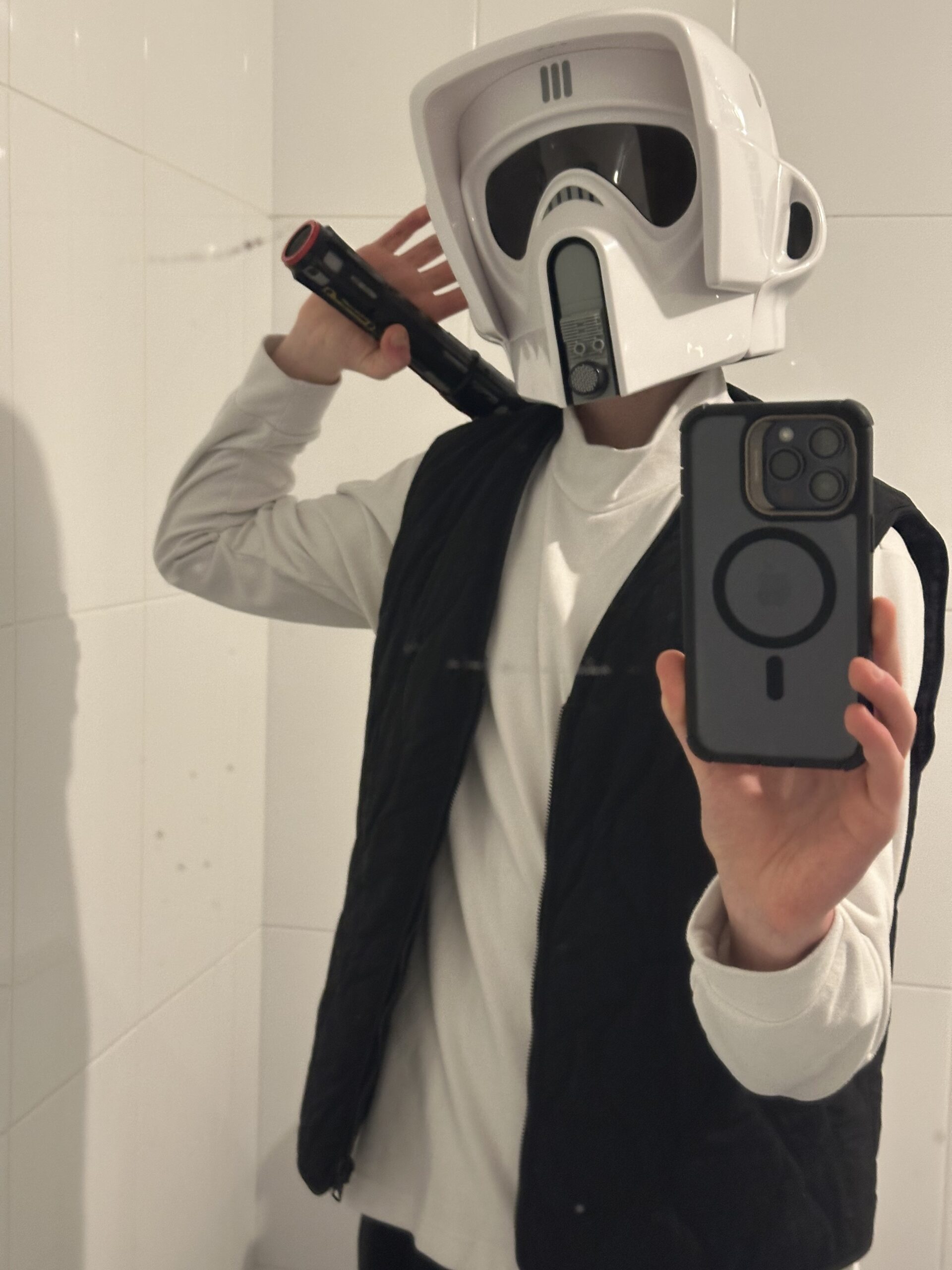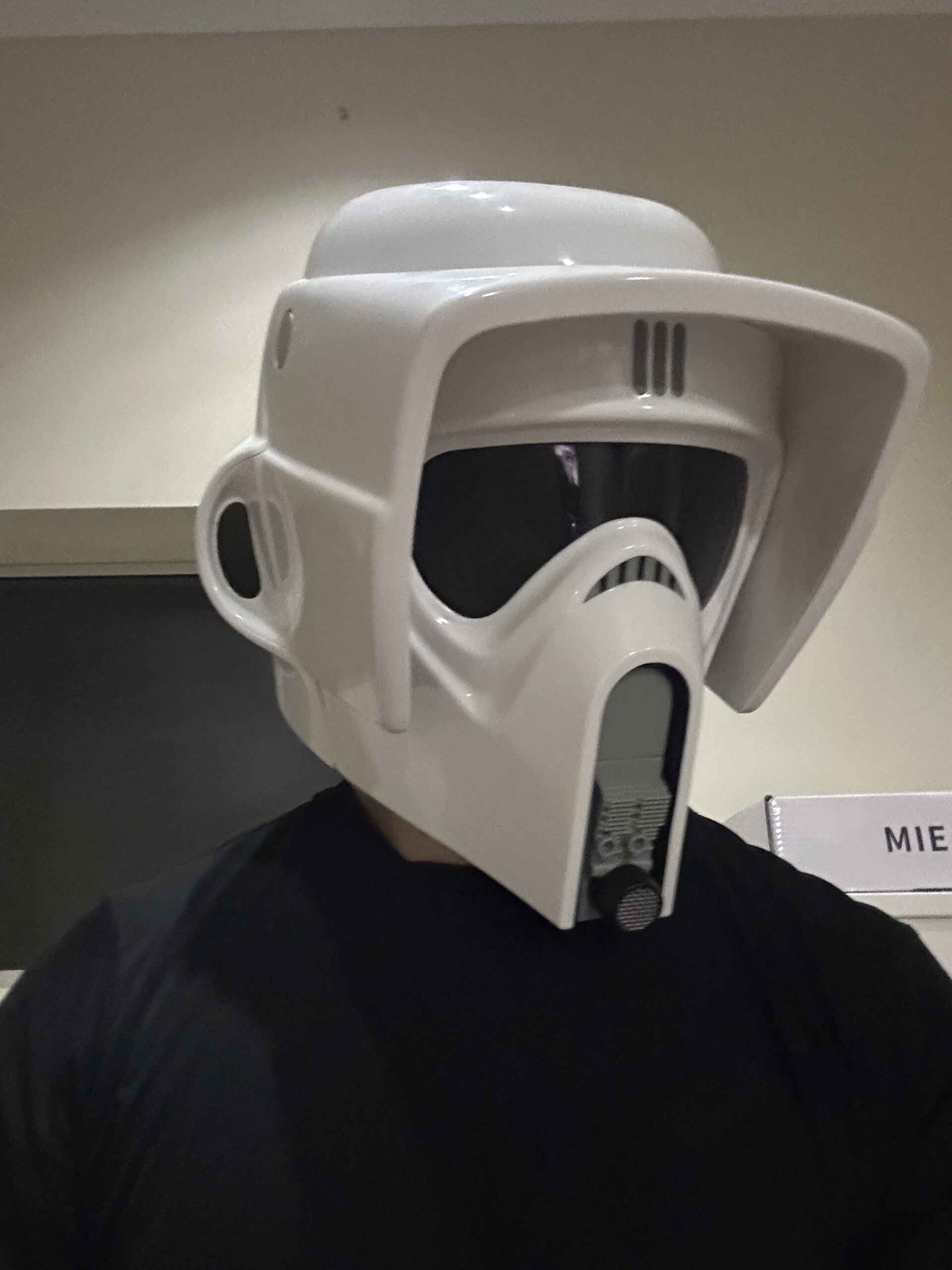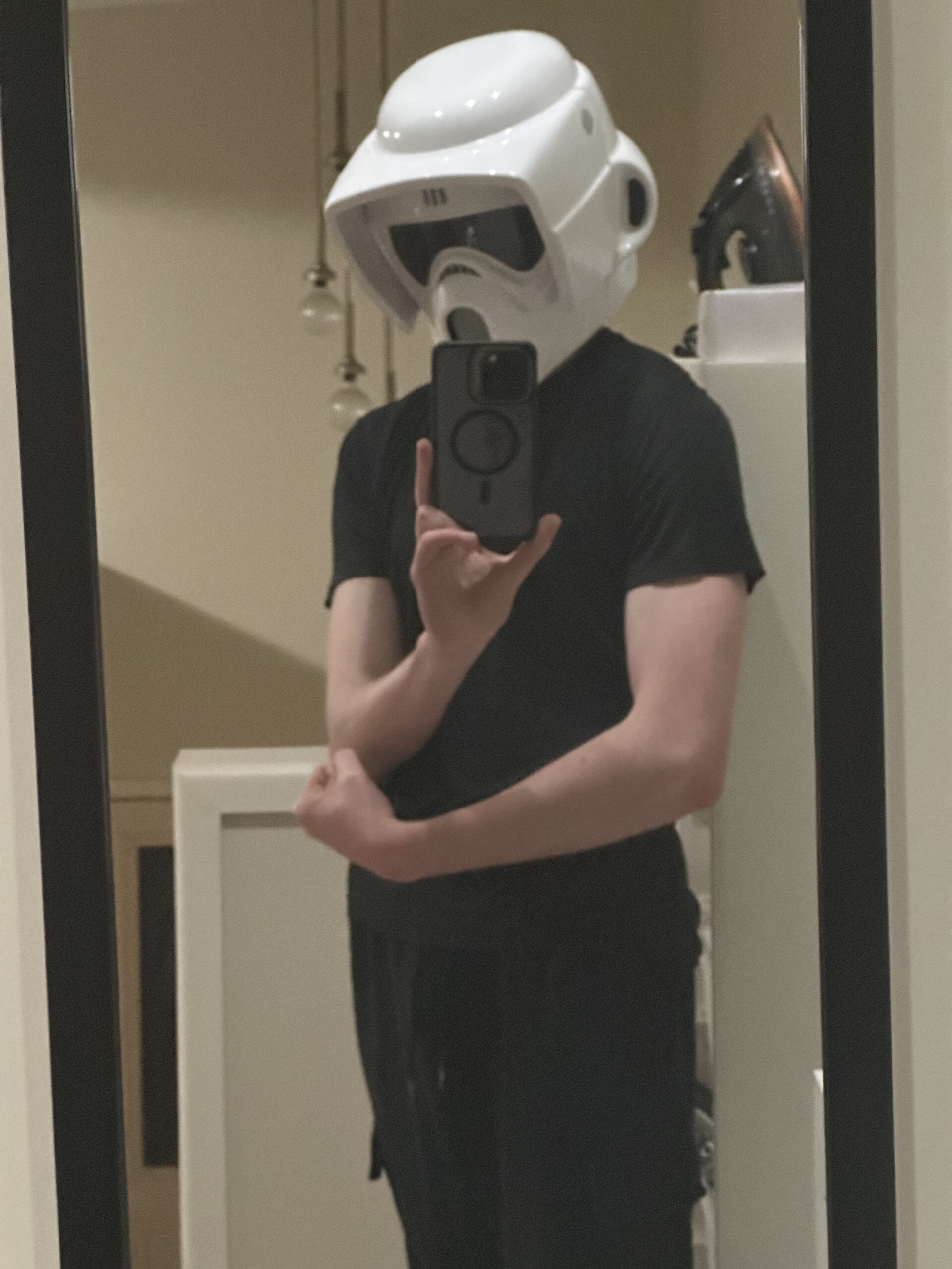 On the topic of Star Wars, I think that learning how to swing around a lightsaber would be pretty cool (just as a thing to do and practice). OOOO! I also have a helmet. It’s an Imperial Scout Trooper helmet that I bought in 2023 for a school event. I can still remember how nervous I was when I showed up in the scout trooper helmet. The event was just a dress-up event for school, “dress up in a costume from someone that starts with the same first letter as your name”. Originally I wanted to get an Inquisitor helmet before realising “oh shet… they don’t really sell those uhhh… anywhere…” so I went to the place that sold the helmets (I forgot the store name tbh) and looked at the helmets there. There was a Darth Vader helmet, a Mandolorian Helmet (which I wanted so badly), a Bo-Katan helmet, a Scout Trooper helmet, and a Rebel X-Wing pilot helmet. I thought about my options before me and said to myself “I could just call myself an IMPERIAL scout trooper hehehe”. But on the actual day I got so nervous I just made up some lie about some stormtrooper called “Ivan”. like bro, my brain shutdown that day because idk?? I was just really shy when I was in Highschool. Sometimes I was super happy and outgoing but that was only when I was in a super duper good mood, otherwise I was more conserved. and DEFINITELY a lot more quiet.